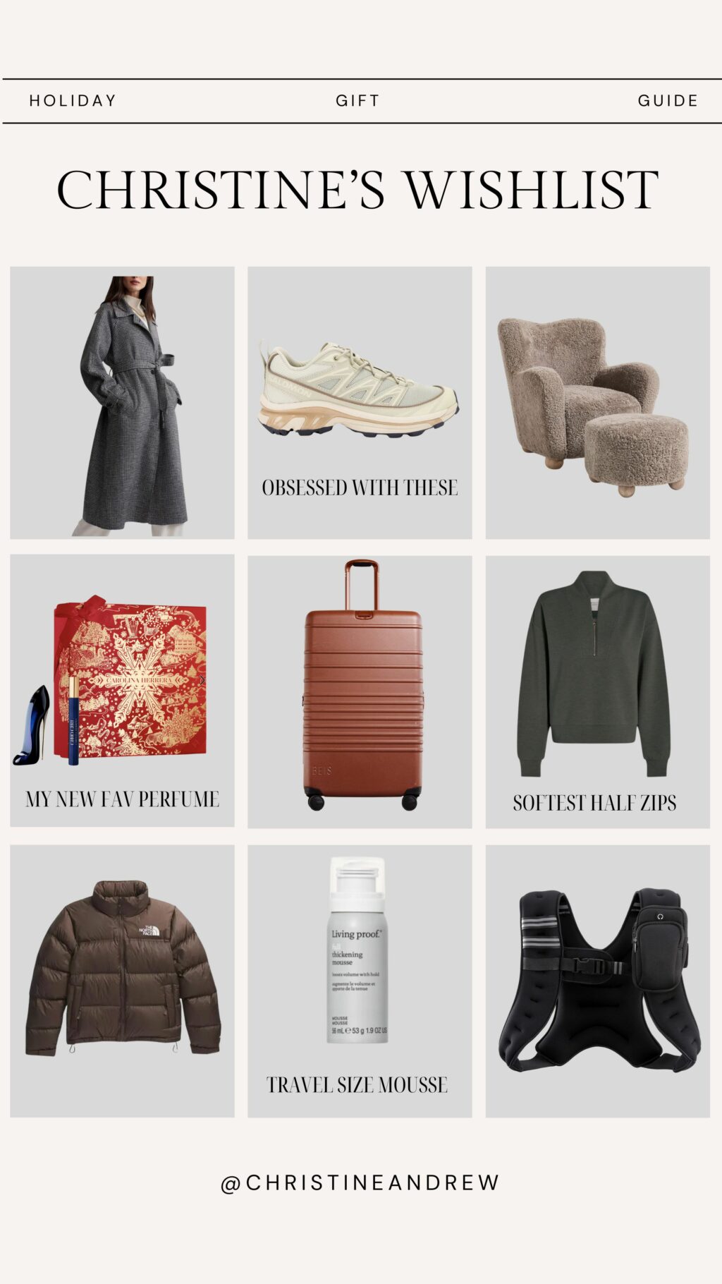 MY WISHLIST: beautiful coat // salomon sneakers // cozy brown chair // favorite perfume gift set // brown beis suitcase // soft half zip // brown puffer coat // thickening mousse // weighted vest