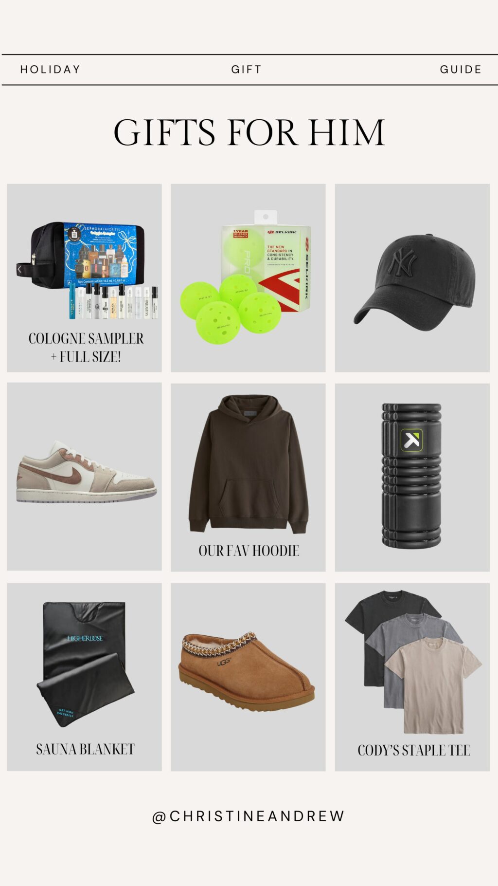 GIFTS FOR HIM: cologne sampler (with voucher for full size!) // pickleballs // yankees hat // nikes // our fav hoodies // foam roller // sauna blanket // ugg slippers // Cody’s staple tees