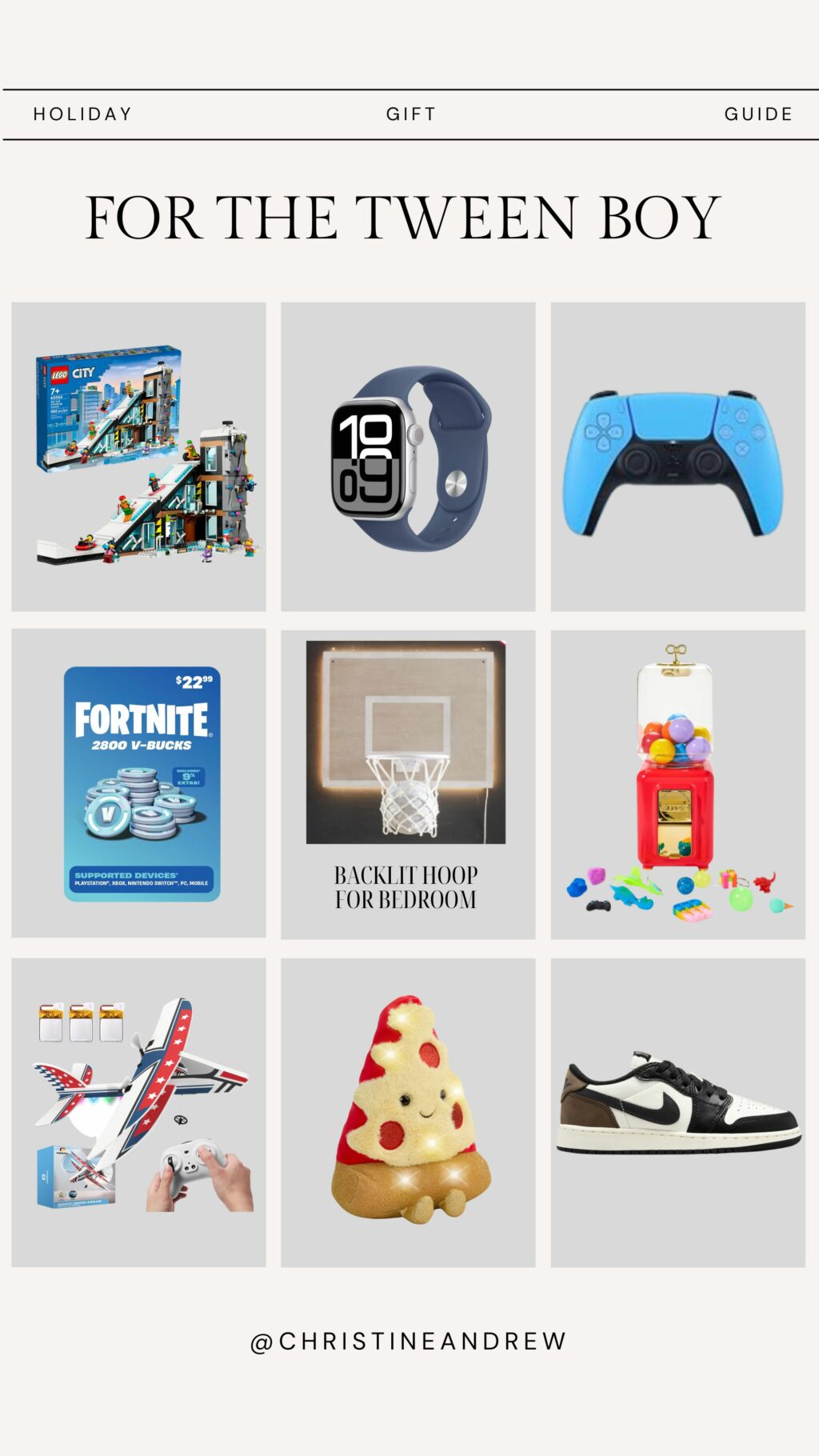 TWEEN BOY GIFTS: ski hill lego // apple watch // playstation remote // fortnite v-bucks // backlit basketball hoop // vending machine toy // remote control airplane // pizza pillow // nikes